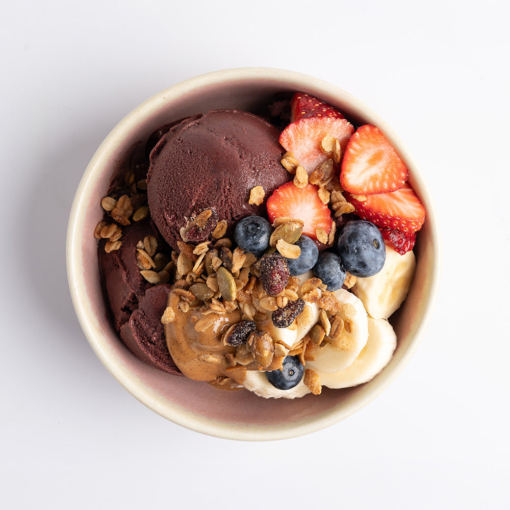 Açai, fraises, bleuets, banane, beurre d'amande et granola