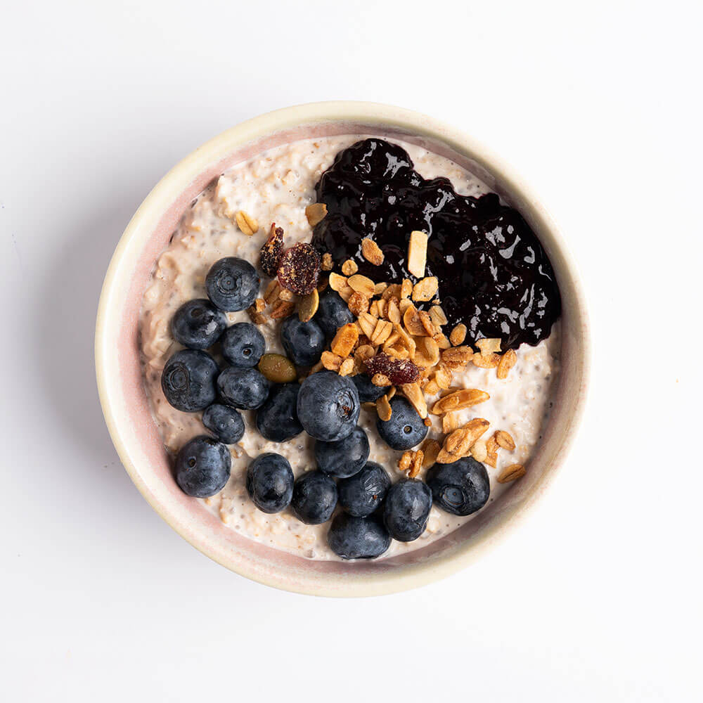 Gruau, granola, Iait d'amande, bleuets, compote de bleuets