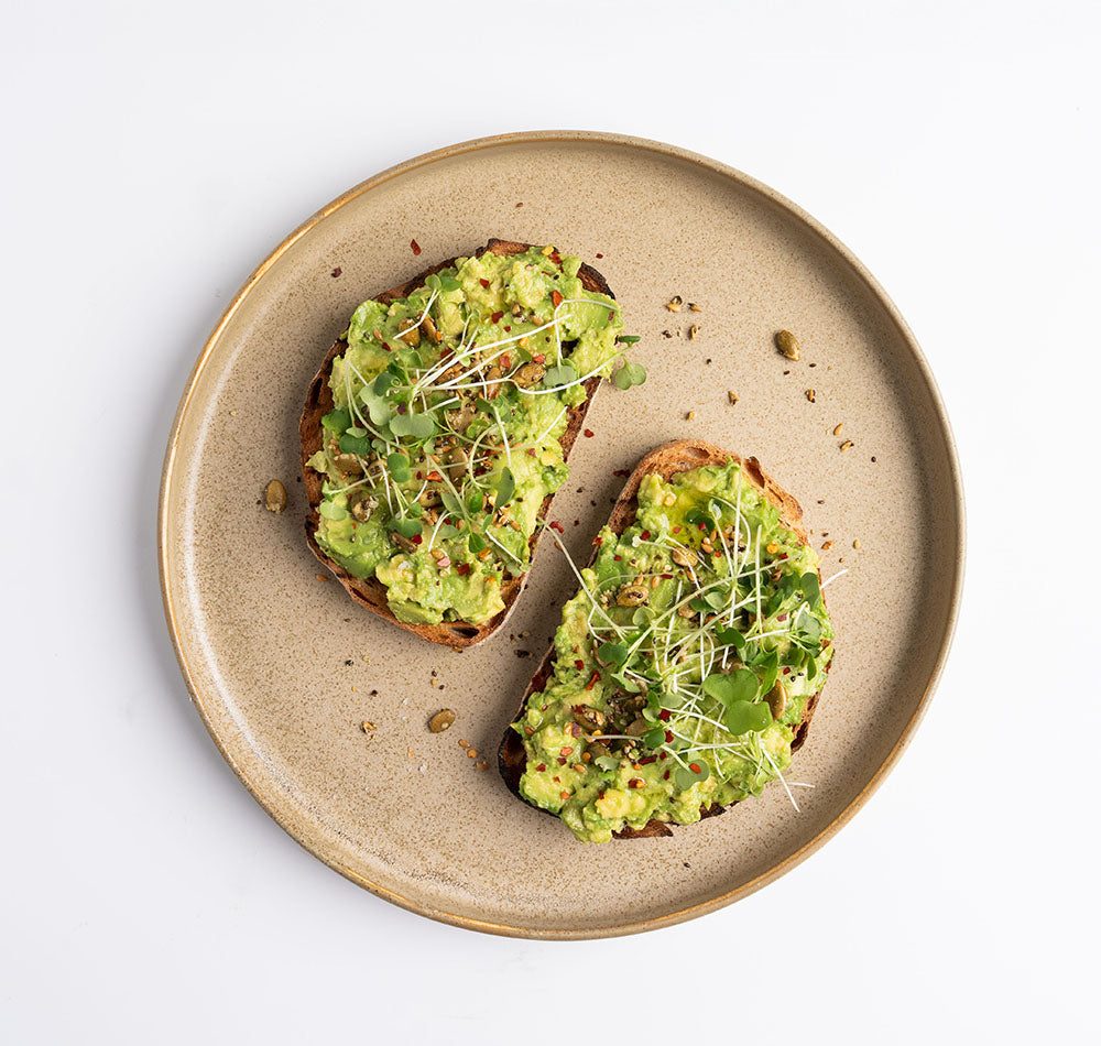 Avocat, huile d'olive, sel de mer, flocons de piment, granola salé, micro-pousses